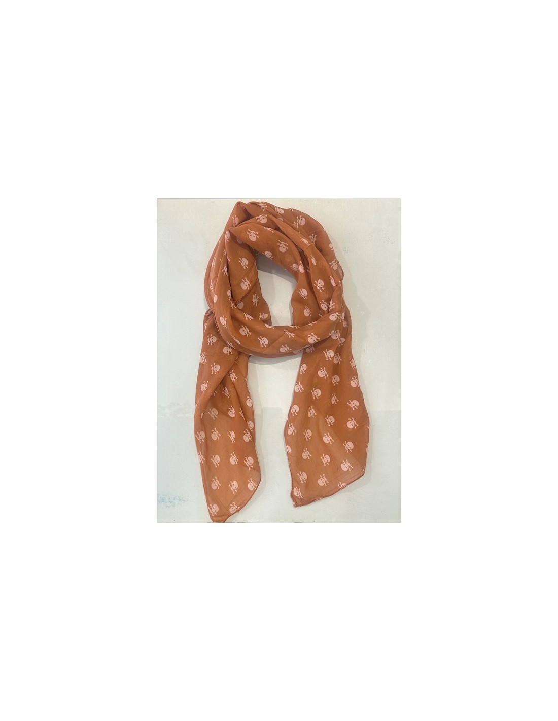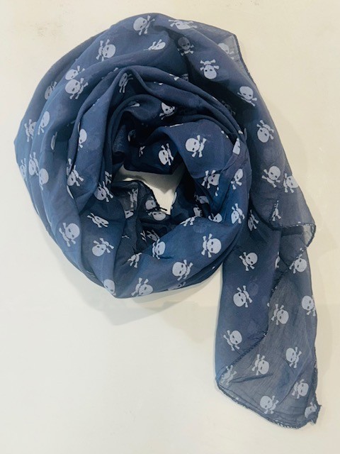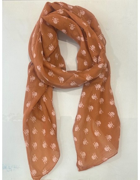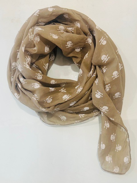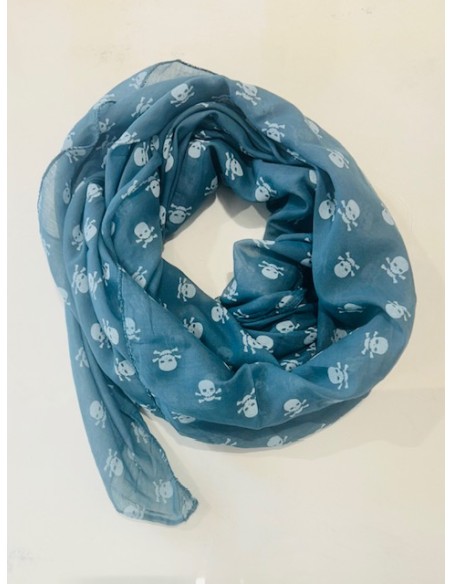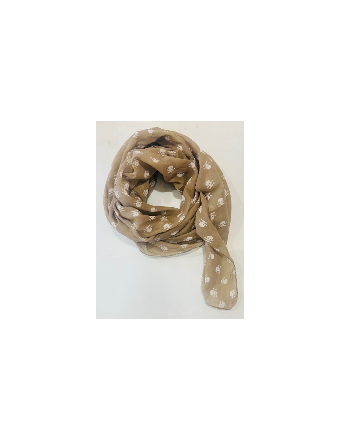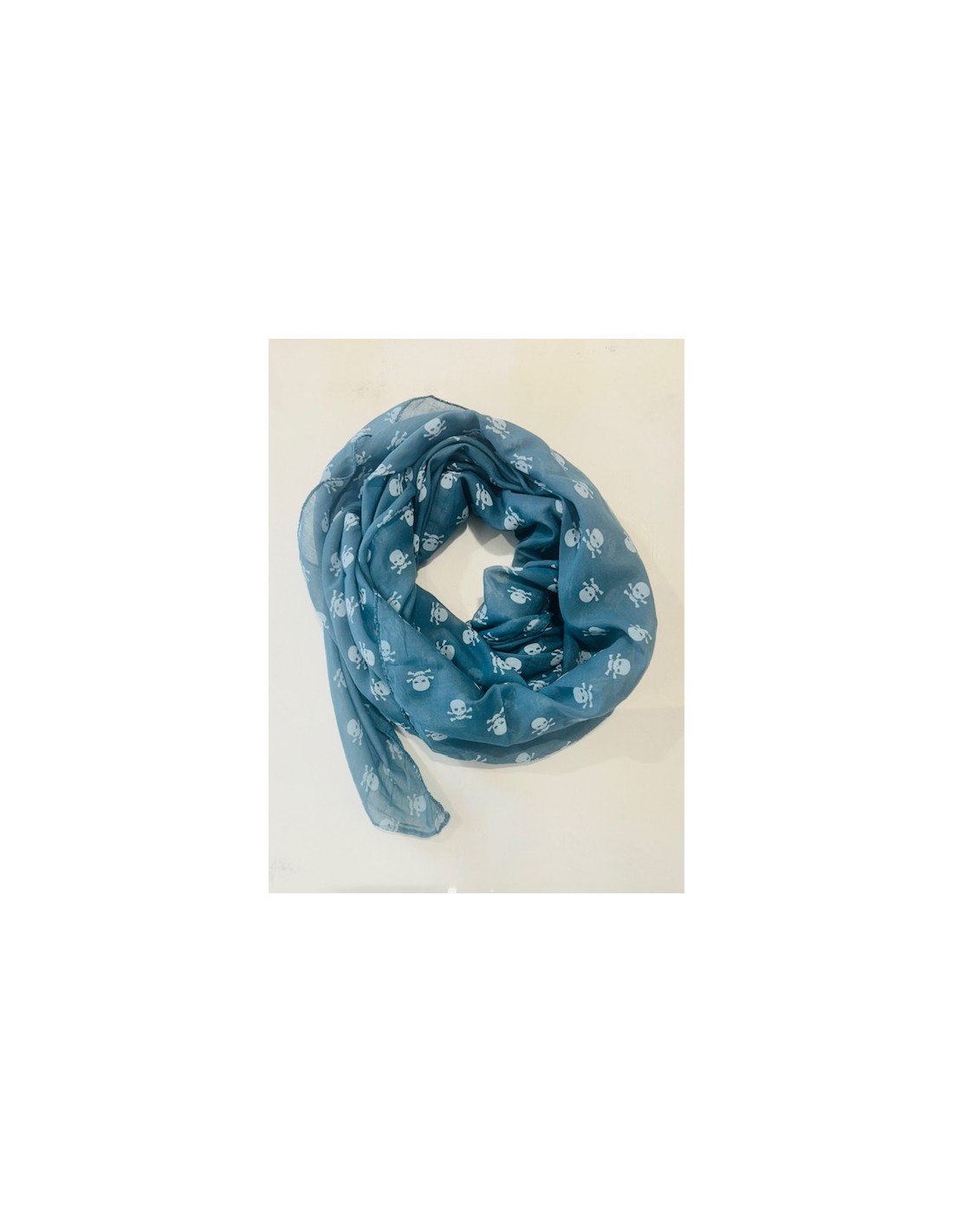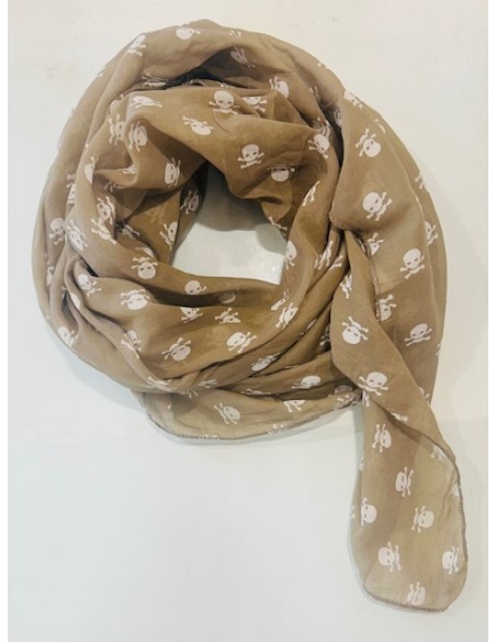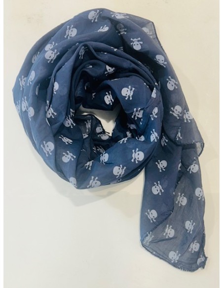 Pañuelo de algodón con un 20% de seda, tacto suave. Cortado al bies. Estampado calaveras.