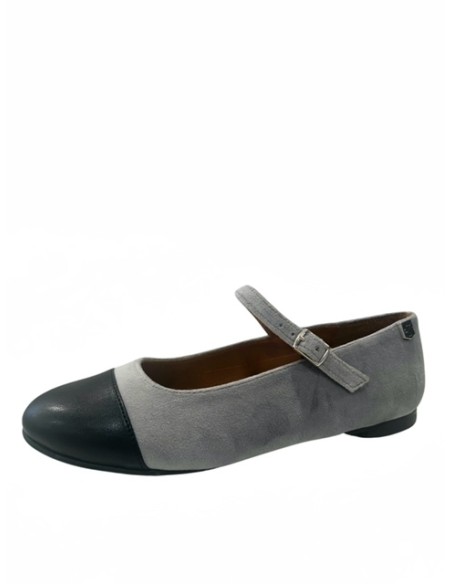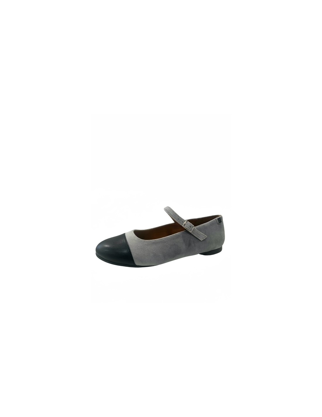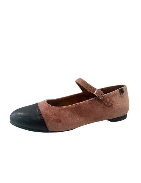 Bailarina de punta redonda con la puntera en piel negra y el cuerpo en terciopelo. Pulsera regulable con hebilla también en terciopelo. Interior forrado en piel vegana con la planta del zapato acolchada.