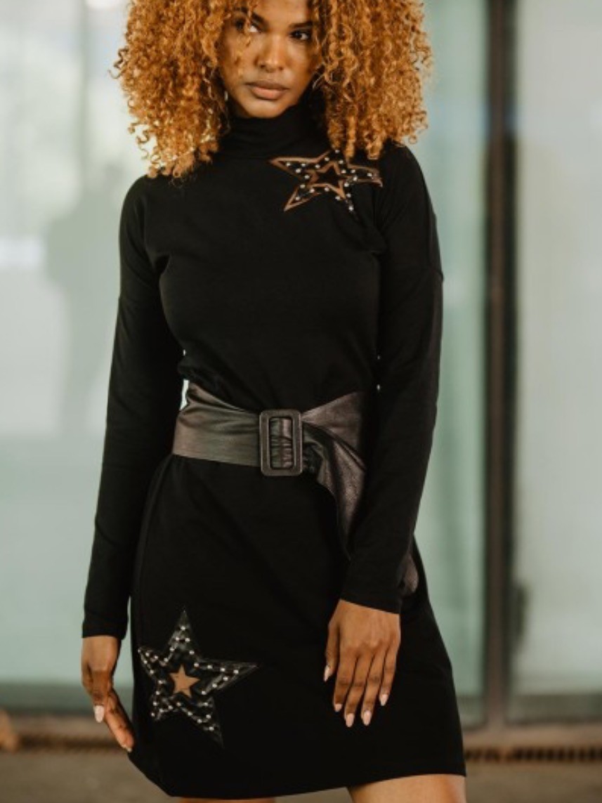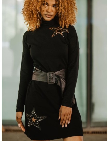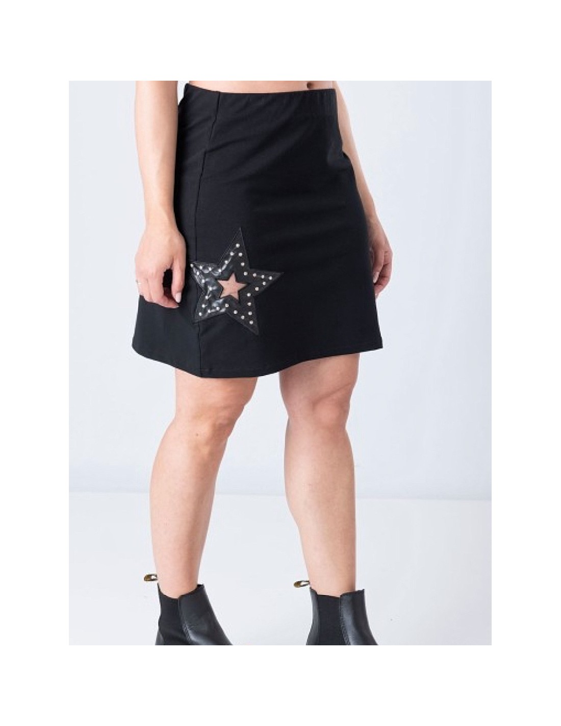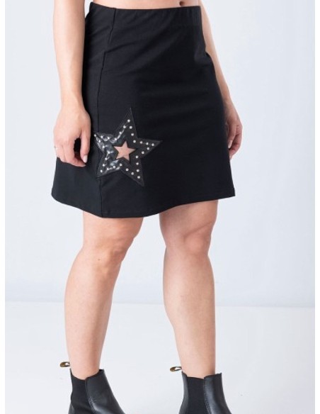 Falda corta con estrella en efecto piel y tachuelas. Cintura elástica, muy cómoda y se adapta perfectamente a outfits elegantes e informales. Diseñada y fabricada en España y Portugal cuidando hasta el más mínimos detalle.