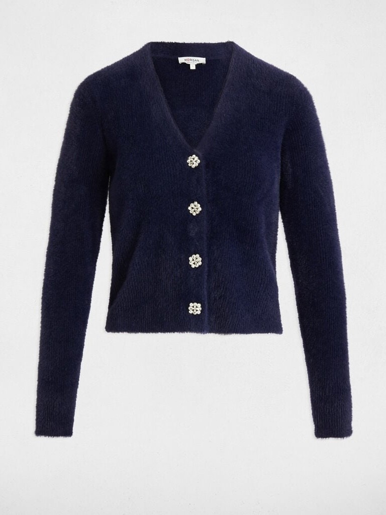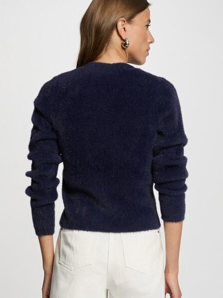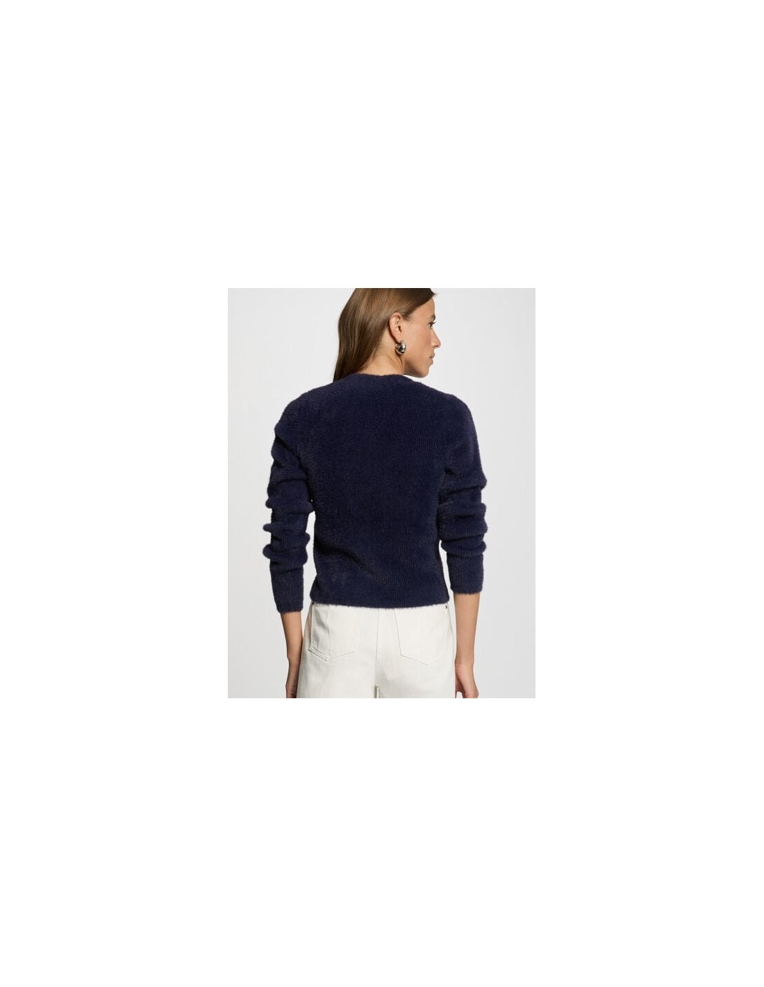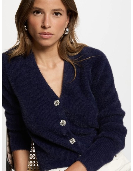 Chaqueta corte básico de mujer, con cuatro botones joya en el frente. Corte recto y manga larga. Tacto de peluche color azul marino.