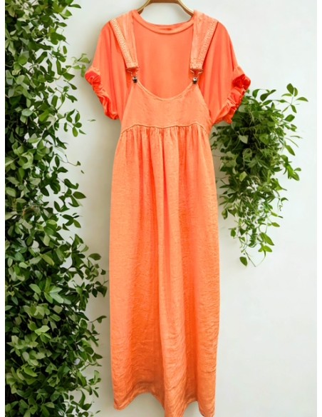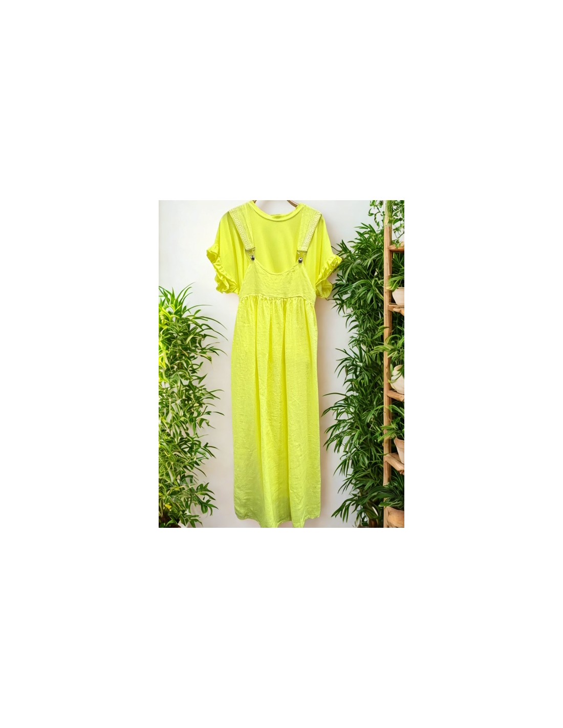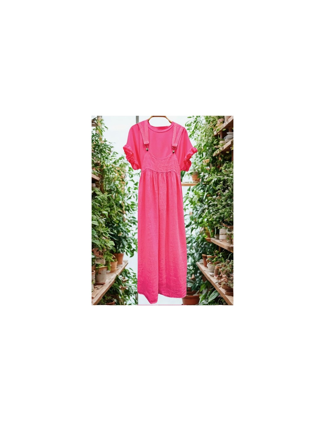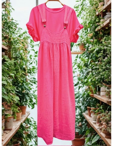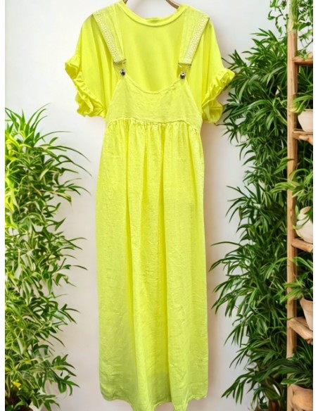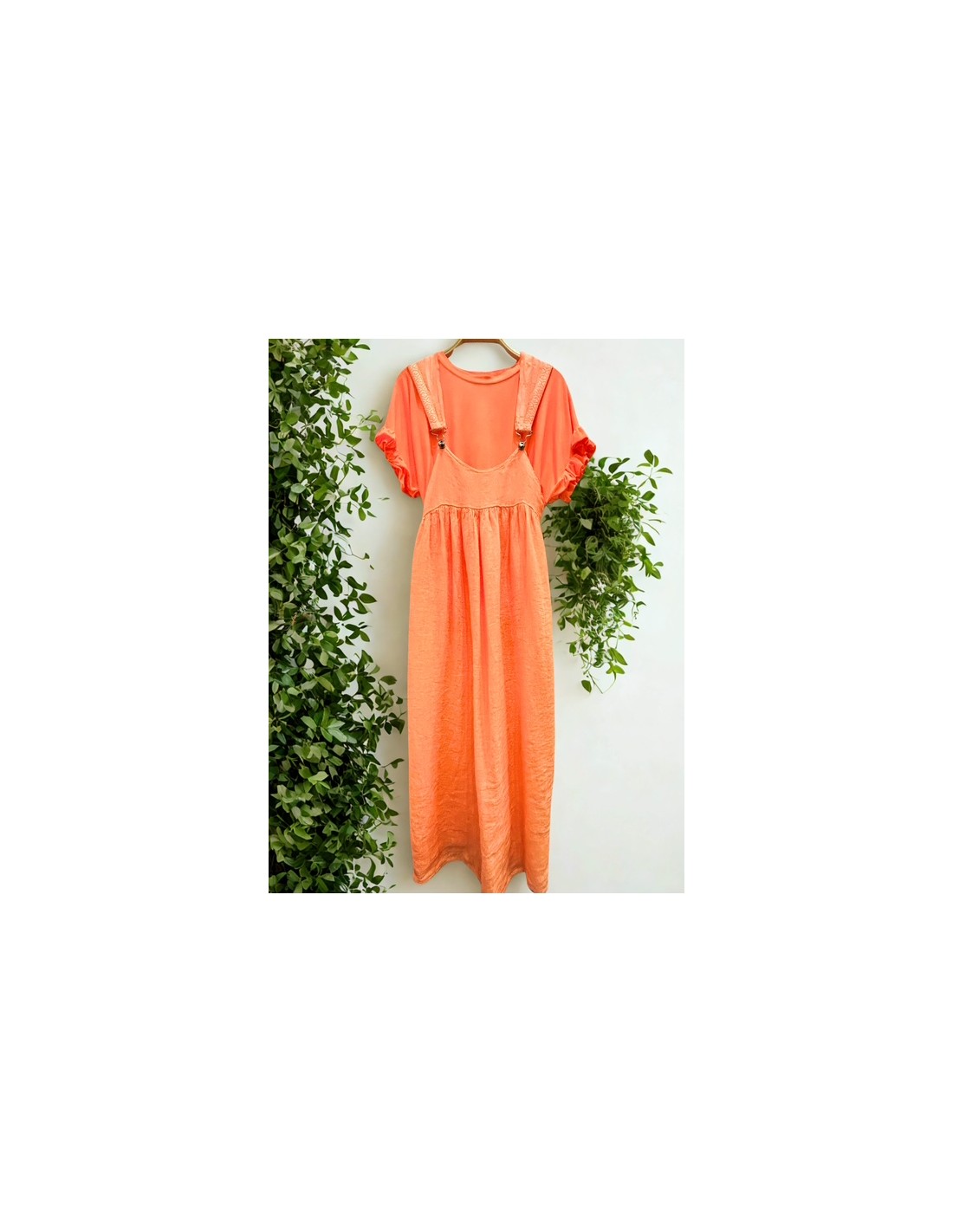 Vestido de lino 100% en la foto aparece con la camiseta en el mismo tono que también encontrarás en nuestra web. El peto con tirantes regulables y largo, talla única con corte ancho.