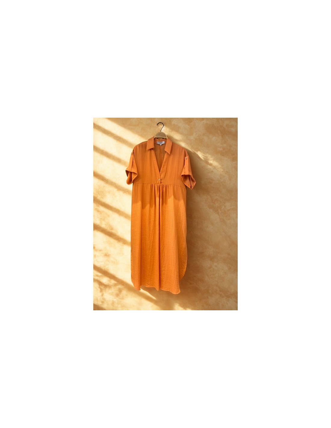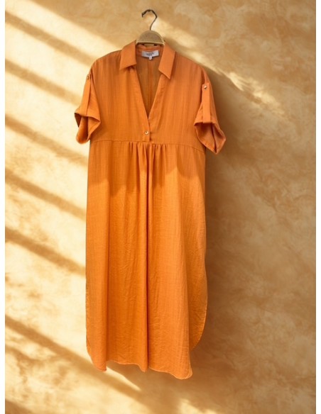 Vestido camisero de manga corta, con vuelta en la manga y estribos. Escote en V. Corte bajo pecho, oversize, finaliza la falda en redondo con dos pequeñas aberturas laterales. Composición: 70% rayón 25% nylon 5% lino
